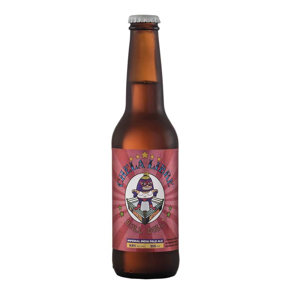 Cerveza Chela Bull Doll. Color rubio claro. 2 diferentes tipos de lúpulo. Predomina el sabor amargo. Notas a toronja y cítricos, con un final dulce. Espuma cremosa con una vivacidad alta.
