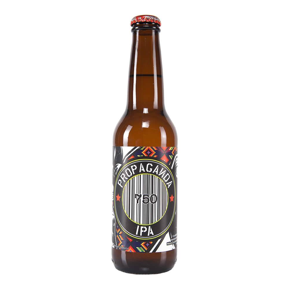 Cerveza Propaganda 750 IPA. Color dorado brillante. Cerveza India Pale Ale al estilo americano tradicional, con notas frutales tropicales, cuerpo ligero a medio con un retrogusto amargo y frutal.